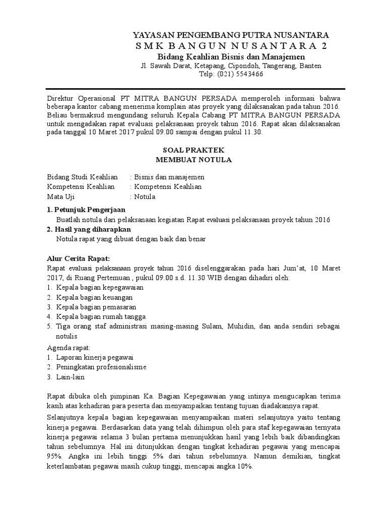 Contoh soal notulen rapat untuk smk jurusan administrasi perkantoran. Menurut kamus besar bahasa Indonesia notulen atau notula bermakna catatan singkat mengenai jalannya persidanganrapat serta hal yang dibicarakan dan diputuskan. Di laman Kamus Besar Bahasa Indonesia yang disediakan oleh Pusat Bahasa kita bisa mencari berbagai macam kata-kata dari bahasa indonesia.