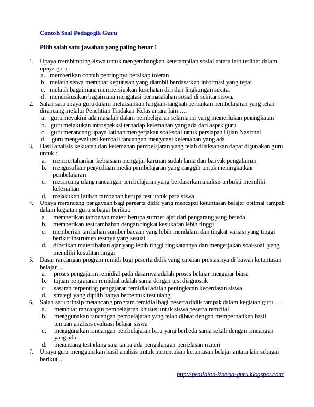 Contoh soal pedagogik 2012 dapat anda gunakan sebagai bahan latihan mengerjakan tes ukg pedogogik secara online sehingga ketika tiba waktunya nanti dalam tes uji kompetensi guru yang sesungguhnya anda akan lebih. Pertama yang harus dimiliki adalah Guru dapat Menguasai Karakteristik Peserta Didik. Soal Uji Kompetensi Pedagogik-Jawaban document.