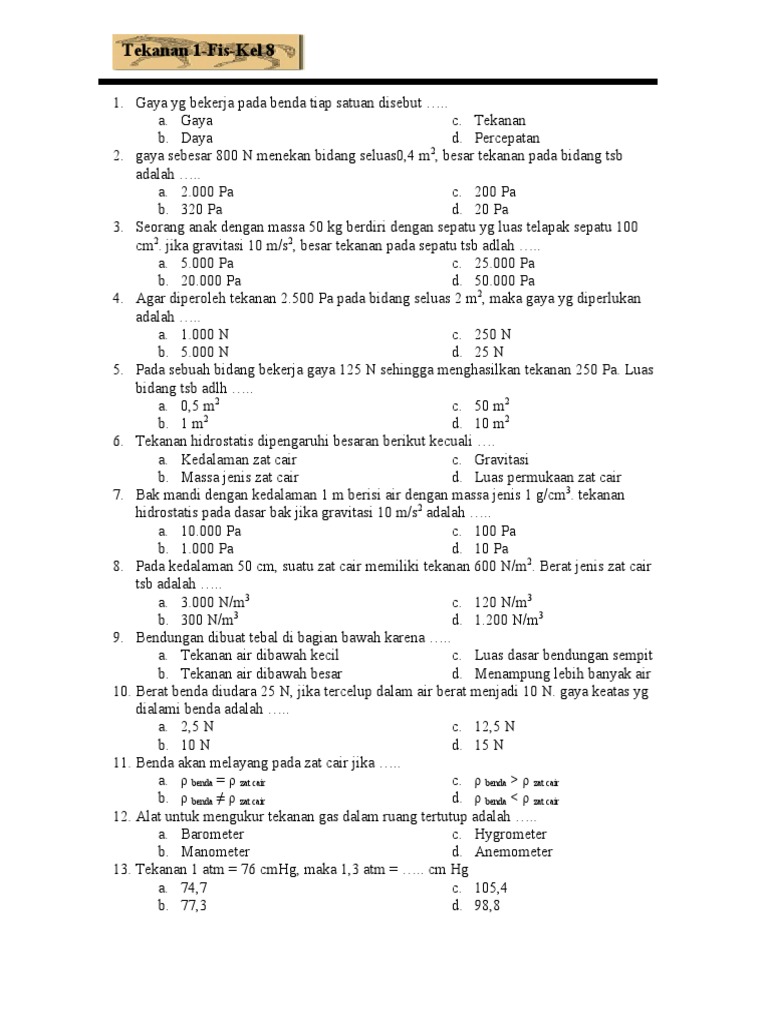 Soal pilihan ganda tekanan kelas 8 kurikulum 2013. Contoh Soal Fisika Zat Cair from kumpulanilmupopuler83. Inilah pembahasan lengkap terkait contoh soal tekanan zat cair kelas 8.
